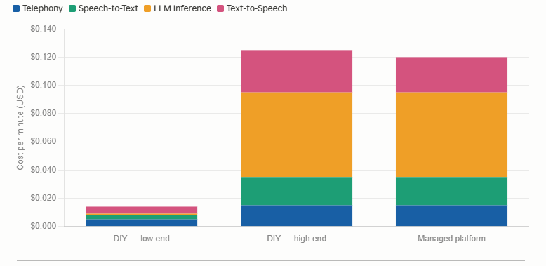 In reality, most businesses choose managed AI voice platforms, where slightly higher per-minute costs are offset by: