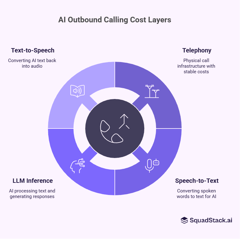 AI outbound calling is a stack of four interconnected technologies. Each one has its own cost driver. Understanding these components is essential before comparing any platform pricing.