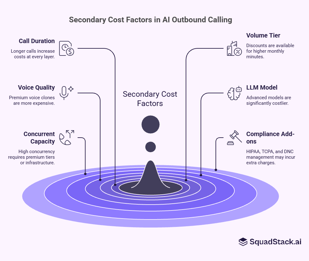 Beyond the core cost layers, several secondary factors significantly influence your final AI outbound calling cost. These variables often determine whether your total spend stays efficient or scales unexpectedly. Optimizing them is key to maximizing ROI from your voice AI investment.