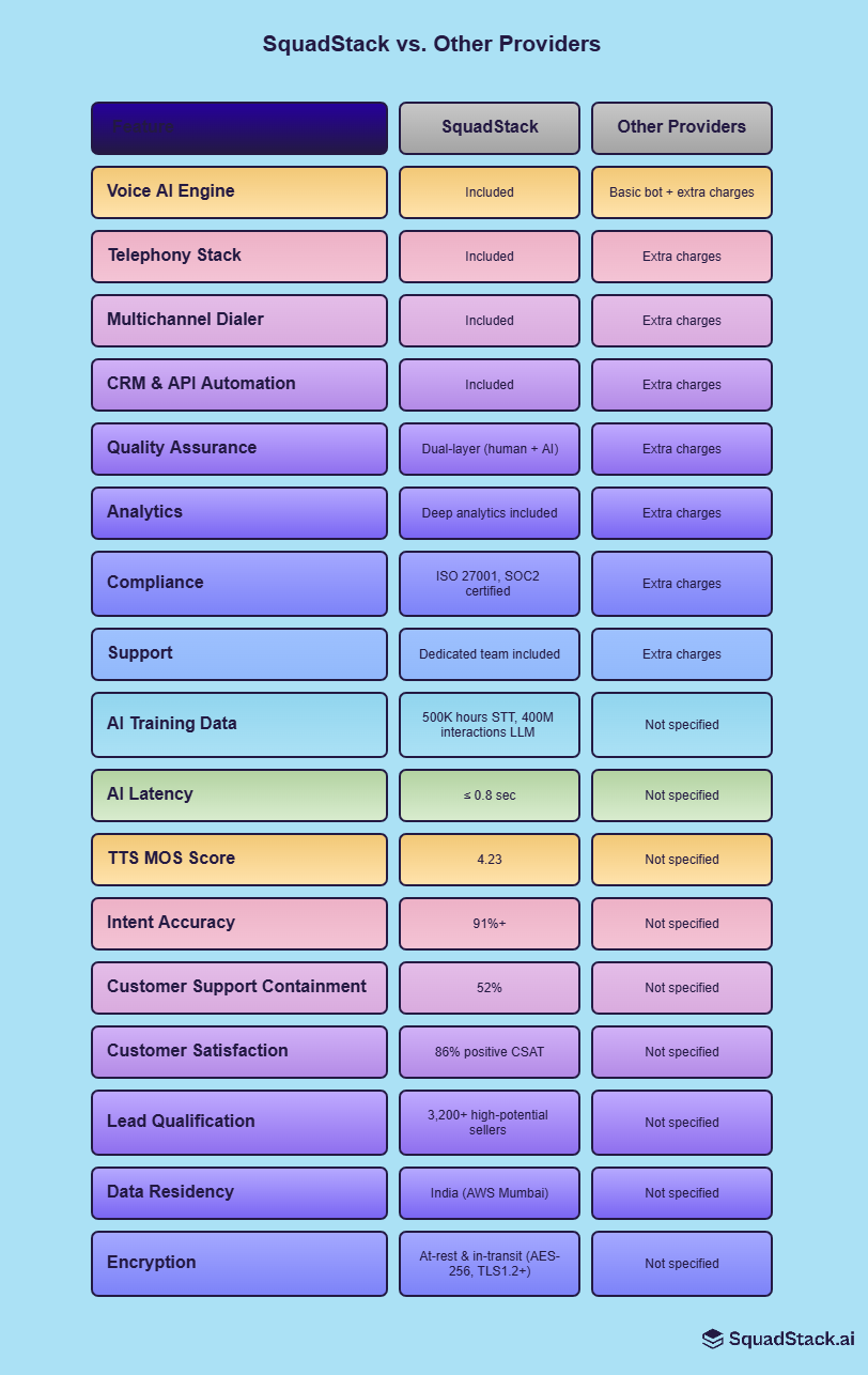 Businesses prefer it because conversations feel more natural, and the AI is trained to handle intent, objections, and follow-up questions effectively. It easily connects with CRMs, and the AI + human audit model ensures accuracy, which is a big plus for industries like BFSI where compliance matters. For teams struggling with large lead lists and inconsistent call quality, SquadStack often becomes the go-to choice.
